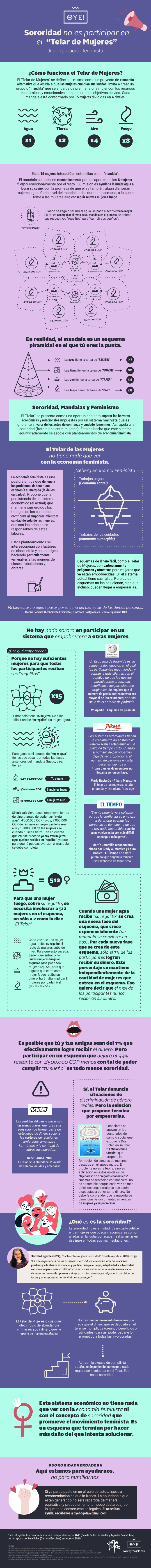 También nos resulta preocupante la apropiación de términos como sororidad o economía solidaria para justificar este esquema. Aunque el discurso está adornado con mandalas, energías transformativas y elementos de la naturaleza, en realidad dista mucho (por no decir que es opuesto) a lo que realmente plantean estas posturas críticas del Feminismo. En otras palabras, aunque parezca un esquema de solidaridad entre mujeres, sus entrañas se basan en el modelo financiero de una pirámide. Sí, una pirámide como DMG (esa que estafó a más de 350.000 colombianos).